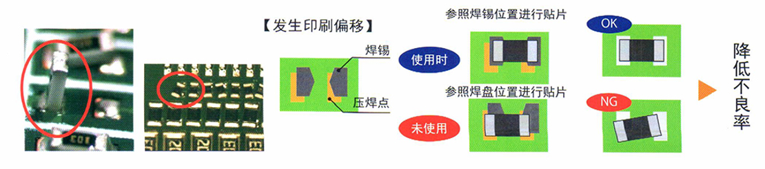通過貼片機內的OCC相機,識別出焊錫印刷的位置偏移,參照焊錫位置補正貼片坐標位置,降低了因焊錫印刷位置偏